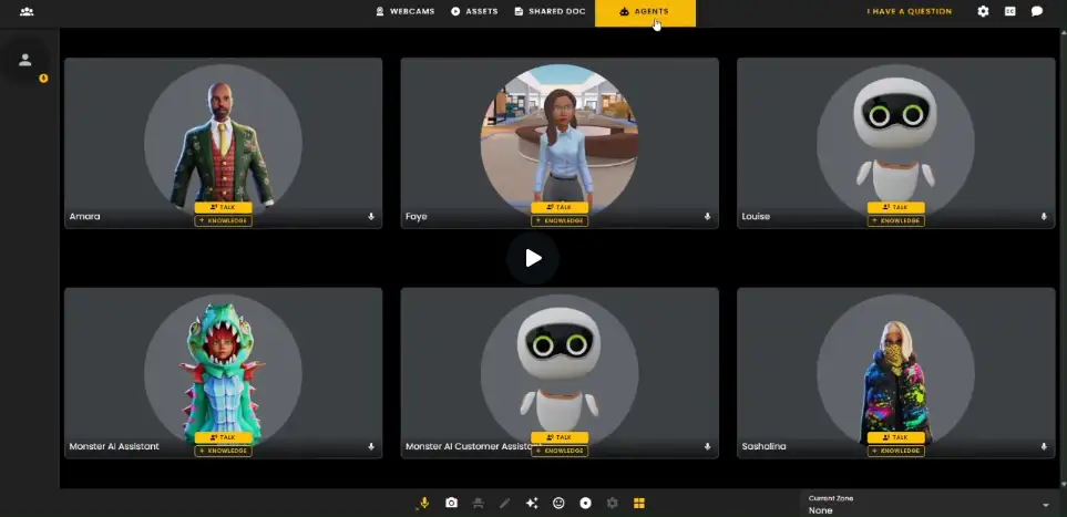The agents tab is an easy-access menu where users can view, manage, and chat with AI assistants. Each agent has its own separate knowledge base, allowing tailored interaction and training.