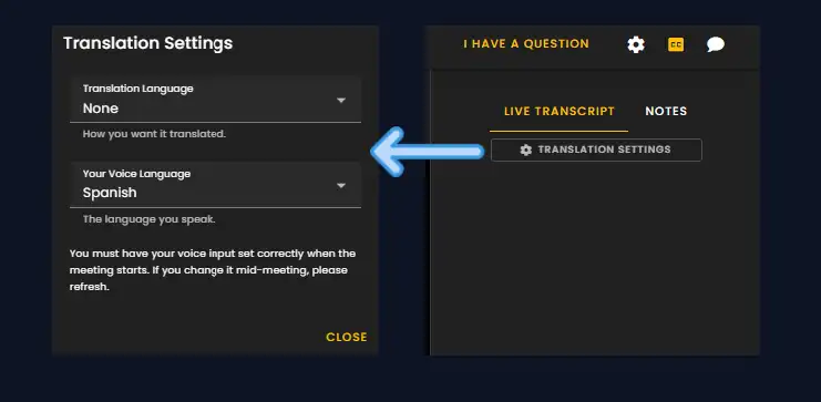 To access translation and live transcript features, click on the 'TRANSLATION SETTINGS' button found in the live transcript panel. This opens the Translation Settings where you can set: